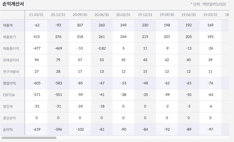 PLUG의 매출액이 최근 마이너스로 되었습니다. 영업이익의 손실규모는 점점 확대되고 있구요. 재무적으로는 좋지 않은 시그널이 많아 보입니다.