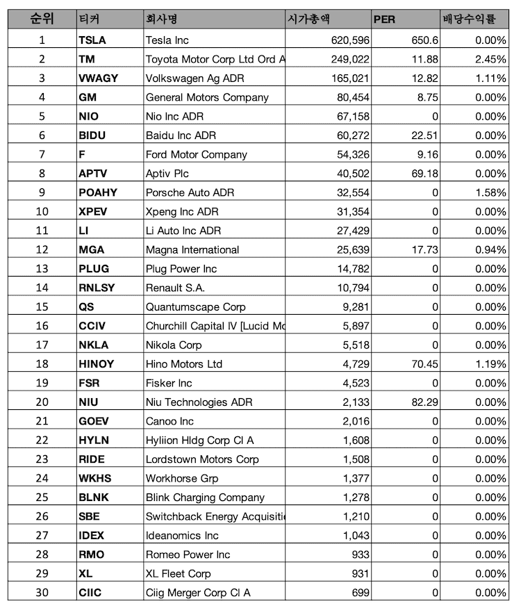 시가총액으로 보면 테슬라, 도요타, 폭스바겐, GM, Nio, 바이두, 포드 등이 상위권을 차지하고 있습니다. 전통적인 자동차 업체가 상당히 포함되어 있음을 알수 있습니다.