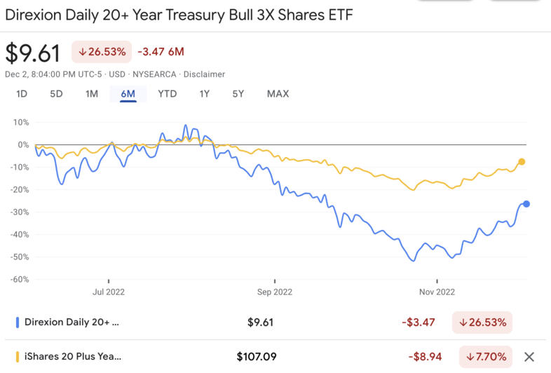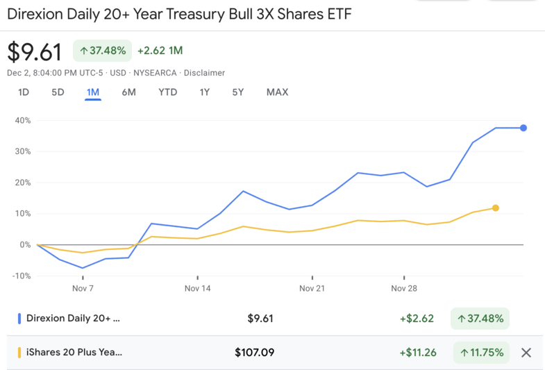 | 명칭 | Direxion Daily 20+ Year Treasury Bull 3X Shares | 장기 채권 가격 변동에 3배로 움직이는 레버리지 투자 상품입니다. |