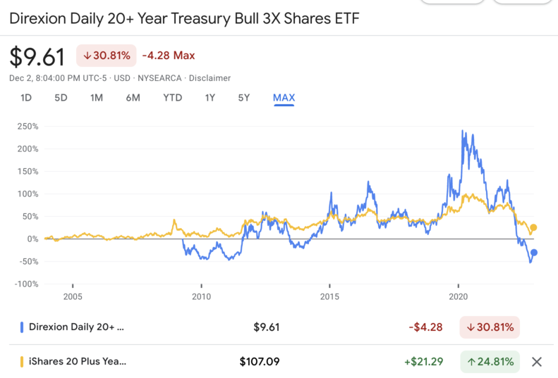 최장 기간으로 봤을때, TMF는 단기간에 (-)로 전환되었고, TLT는 그나마 수익을 유지했습니다.